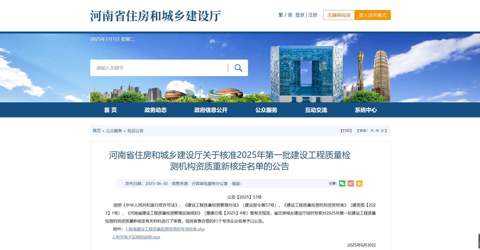 熱烈祝賀我司通過河南省住建廳2025年第一批建設(shè)工程質(zhì)量檢測機構(gòu)資質(zhì)重新核定?。?!